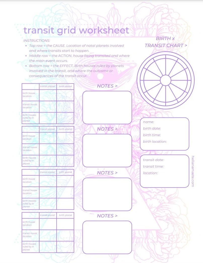 Notice which of your birth planets are being transited. In the top row, record the transiting planet, the aspect being formed, and the birth planet. (Hint: to save space, you’ll want to know the “notation” or symbol for the aspect being formed!) This reveals the CAUSE.